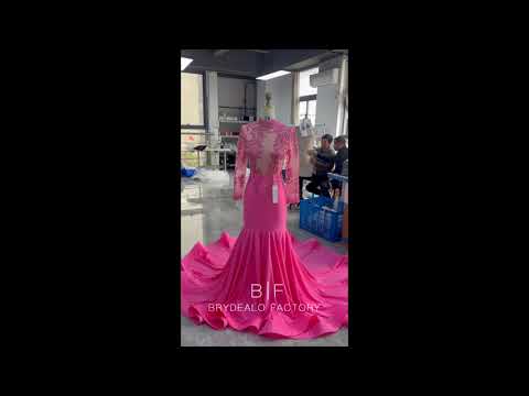 Be the epitome of grace in our Flamingo Mermaid Prom Dress. Featuring an illusion bodice with long sleeves and a high neckline, adorned with hand-sewn beaded lace. The elastic jersey long skirt boasts a ruffled hem for added flair.