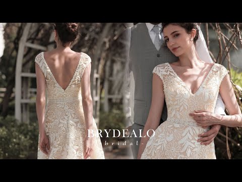 Designed in a true A-line silhouette, this cap sleeve wedding dress from Brydealo is a dream come true. Traditional venise lace starts from the cap sleeve bodice with subtle V-neckline, down through the long A-line skirt. The trivial lace trim adorns the fine V-neckline and armholes. A delicate flower lace trim on natural waistline spaces out the elegant top and blooming bottom with a fine chapel train. Zipper with ornamental satin buttons on flattering V-back bring a perfect finishing.