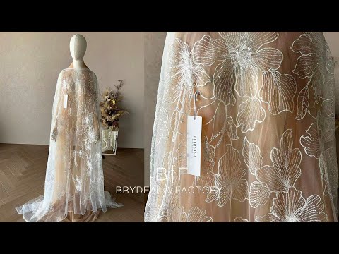 This beautiful lace for wholesale features large flower embroidered on illusion base tulle adorned with tiny clear sequins, which is perfect for making high-end wedding dresses and formal gowns.